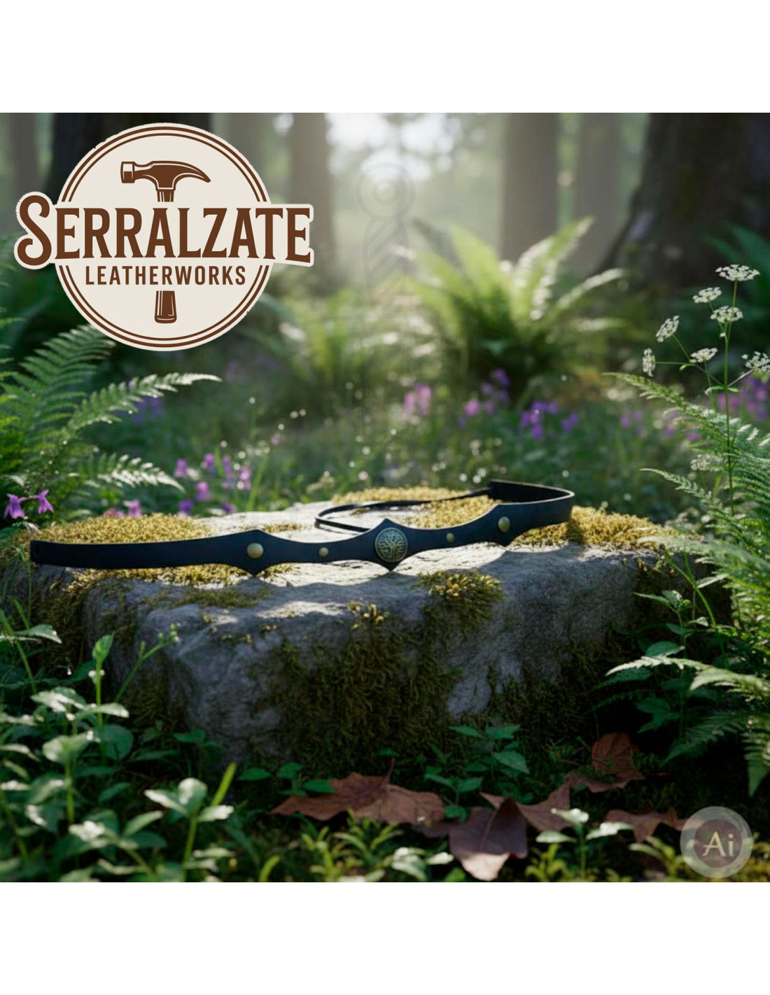 Gemaakt van hoogwaardig leer, heeft deze diadeem een delicate metalen versiering van de levensboom, verguld in oud goud, die groei, vernieuwing en de eenheid tussen alle levende wezens symboliseert. Het verstelbare ontwerp aan de achterkant, met een leren koord, zorgt voor een comfortabele en aanpasbare pasvorm voor verschillende hoofdgroottes en stijlen.