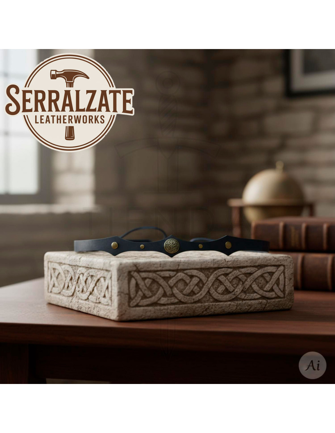 Perfect voor wie een vleugje Keltische identiteit aan zijn dagelijkse look wil toevoegen of voor speciale gelegenheden, maakt de elegante afwerking elk gebruik tot een unieke ervaring. De textuur van het leer en de subtiele glans van de metalen versiering in oud goud zorgen voor een verfijnd contrast, ideaal te combineren met natuurlijke of bohemien kleding.