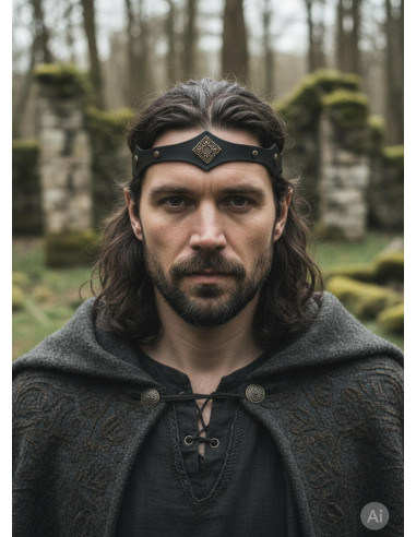 Ben je op zoek naar een vleugje middeleeuwse elegantie dat je kunt aanpassen aan jouw stijl? De middeleeuwse tiara Florian uit het bos in zwart is de perfecte keuze voor wie een authentieke en ambachtelijke afwerking in elk detail wil. Het veelzijdige ontwerp past zich gemakkelijk aan dankzij een praktische leren knoop aan de achterkant, wat comfort en een perfecte pasvorm garandeert zonder gedoe.