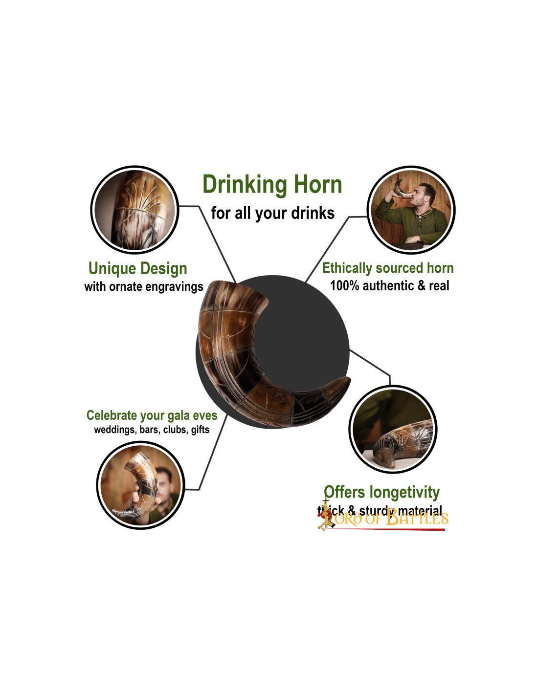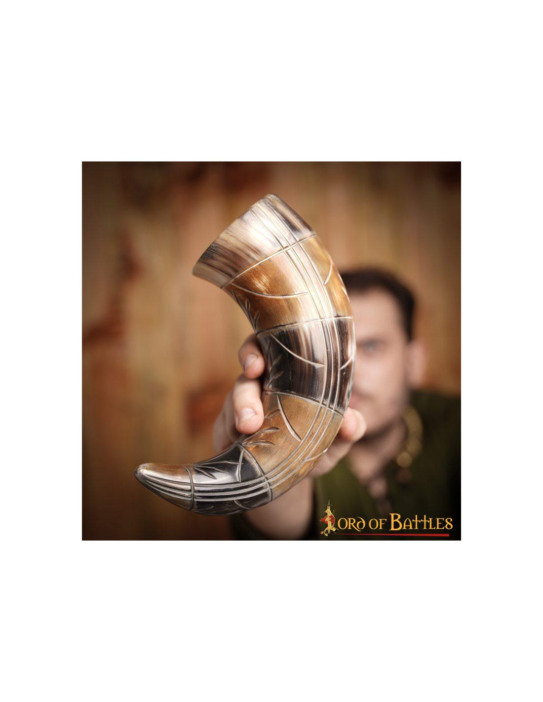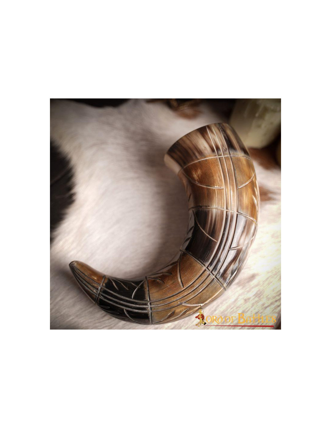 Ontdek de authentieke Viking Ox Horn om te drinken met gegraveerde ontwerpen. Deze uitzonderlijke en authentieke hoorn wordt met de hand gemaakt van de beste ossenhoorns. De totale capaciteit is ongeveer 400-500 ml, perfect om van je favoriete drankjes te genieten, of het nu bier, mede of een ander heerlijk drankje is.