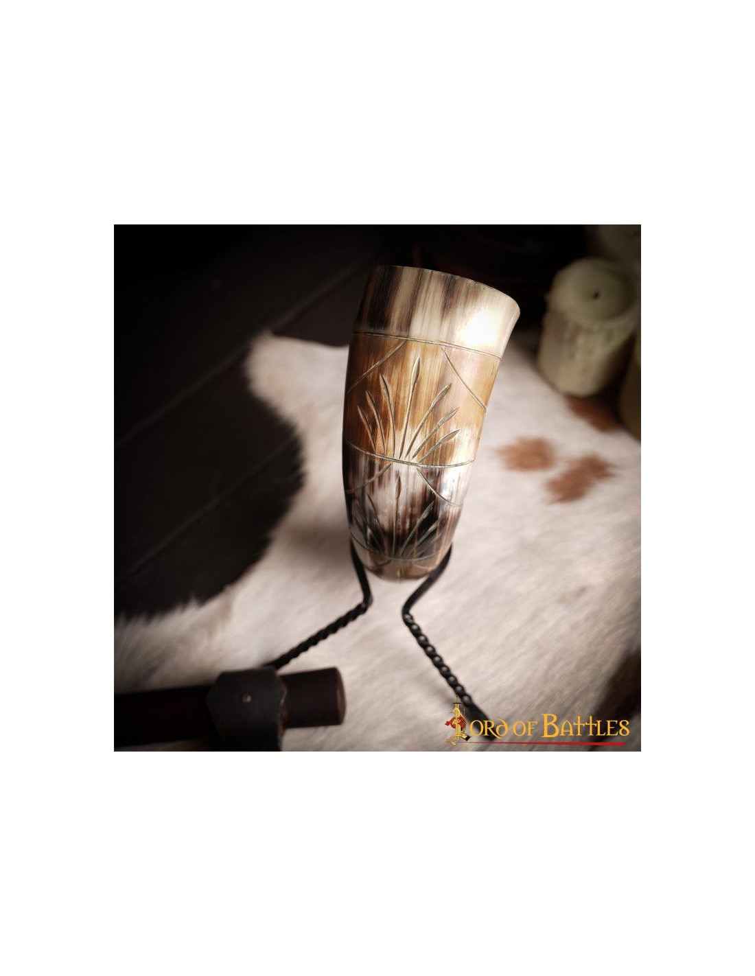 Deze drinkhoorn is meer dan alleen een schaal, het is een waar kunstwerk. Elk is zorgvuldig gegraveerd met unieke ontwerpen, waardoor het een speciale, authentieke uitstraling krijgt. Gegraveerde motieven op verkoolde vlekken voegen een vleugje klasse en verfijning toe aan deze prachtige Vikinghoorn.