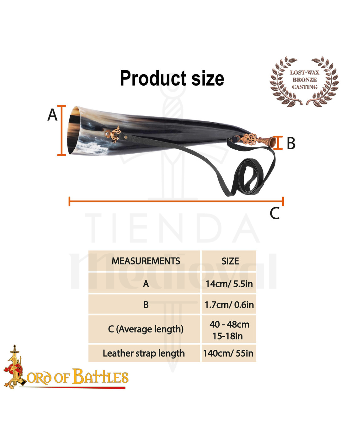 Het gebogen ontwerp bevordert de grip en ergonomie bij het vasthouden of vervoeren, en de verstelbare zwarte riem met metalen haak maakt van het hoorntje een comfortabel accessoire, klaar voor thematische marsen, voorstellingen of historische bijeenkomsten. Het gepolijste oppervlak vergemakkelijkt het schoonmaken en behoudt de natuurlijke uitstraling van het materiaal zonder de authenticiteit te verliezen.