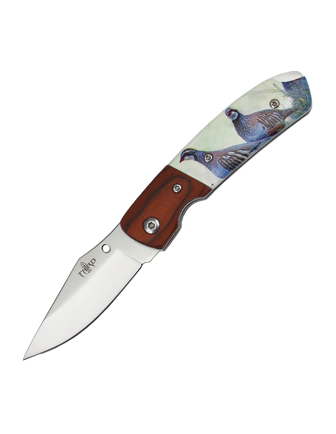 - Houten en ABS-handvat met 3D-patrijsdecoratie: Het houten en ABS-handvat zorgt voor duurzaamheid en een klassieke uitstraling, terwijl de 3D-patrijsdecoratie een verbluffend driedimensionaal effect creëert. Dit voegt een vleugje elegantie en originaliteit toe die hem onderscheidt van andere messen.
