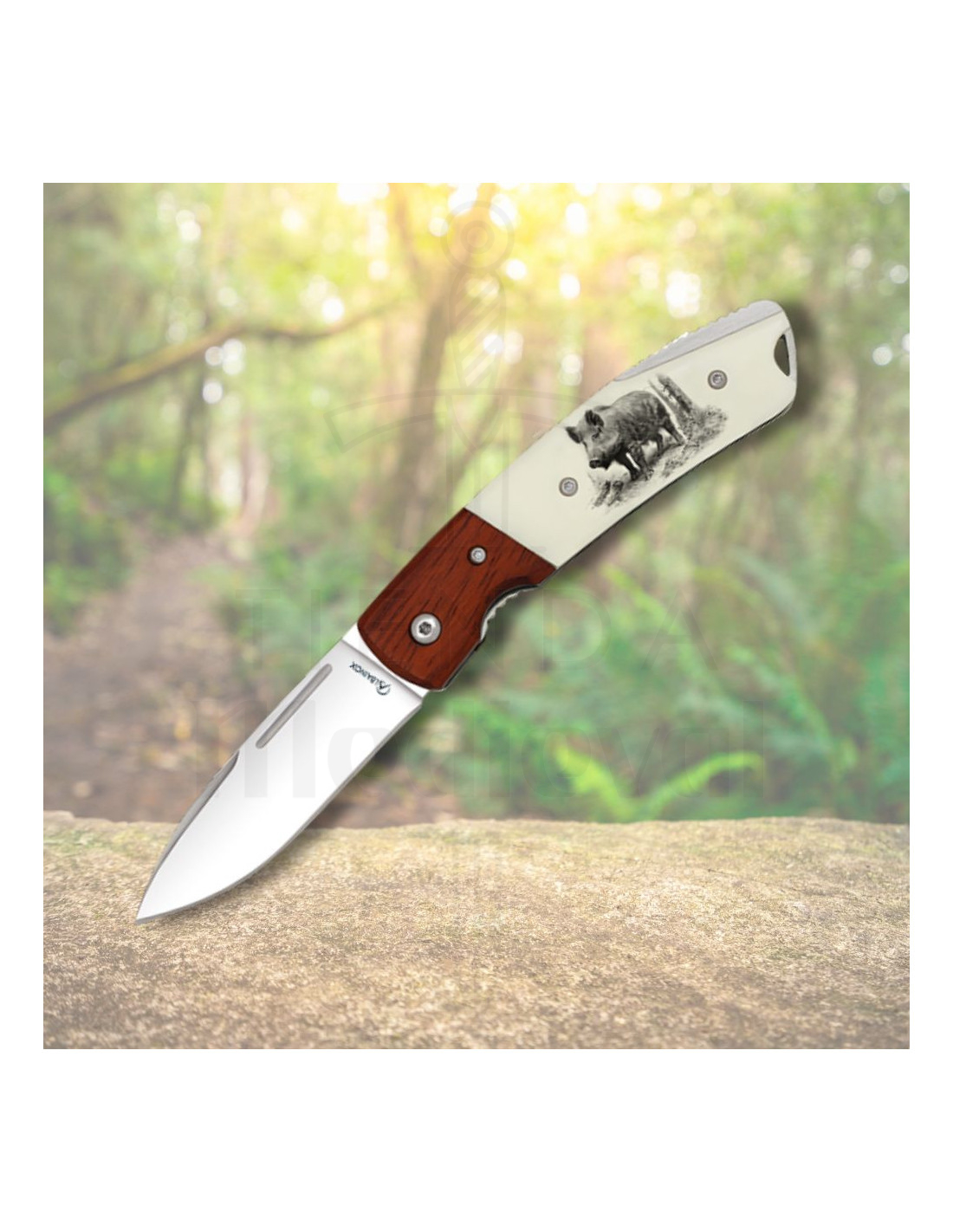 Het handvat, ontworpen om perfect in de hand te passen, combineert materialen die zowel lichtgewicht als duurzaam zijn. De gedetailleerde gravure van het everzwijn voegt een onderscheidend accent toe dat kracht en verbondenheid met de natuur weerspiegelt, terwijl het ergonomische ontwerp met zichtbare schroeven een stevige en stabiele grip belooft voor nauwkeurige manoeuvres.