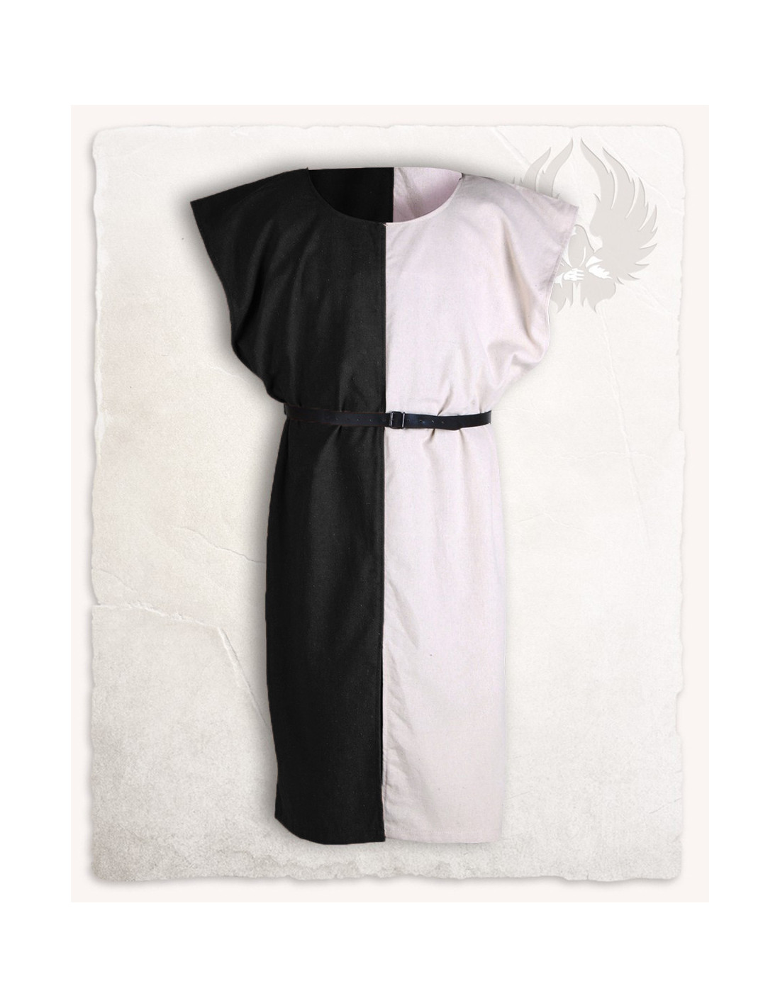 Het tweekleurige zwart-crème tabberd Ignaz, van het gerenommeerde Duitse merk Mytholon, is de perfecte keuze voor wie op zoek is naar een kledingstuk dat zijn krijgersgeest weerspiegelt. Met zijn afmetingen van 73 cm breed en 126 cm lang past hij zich perfect aan je lichaam aan en biedt hij je een ongeëvenaard comfort.