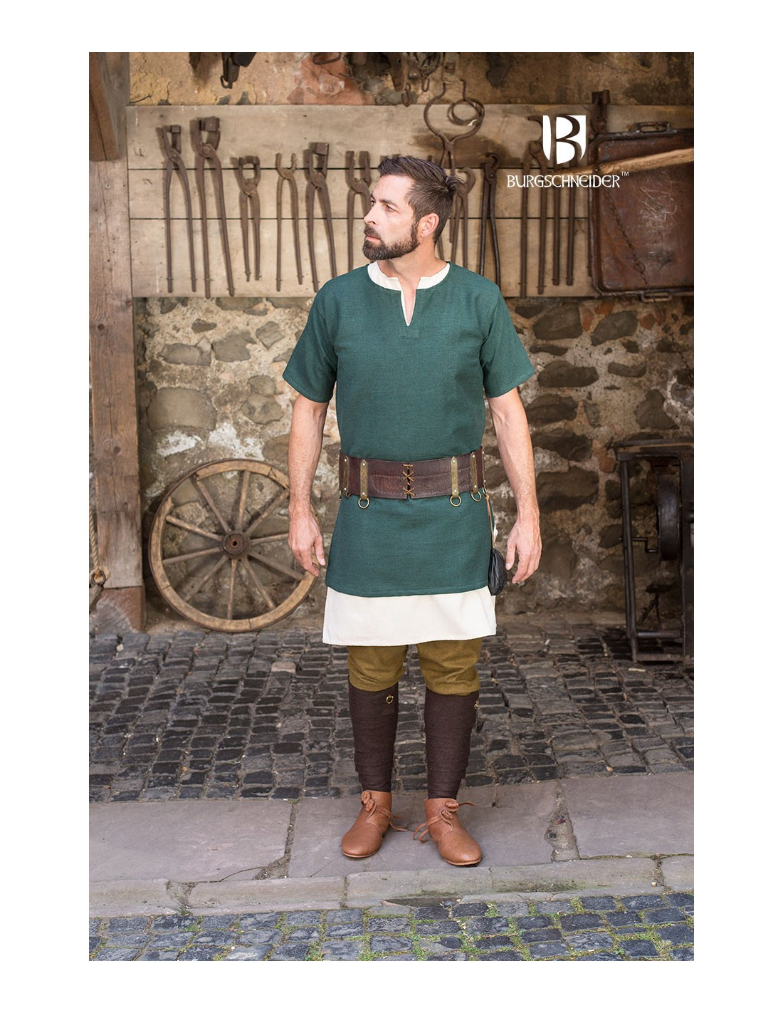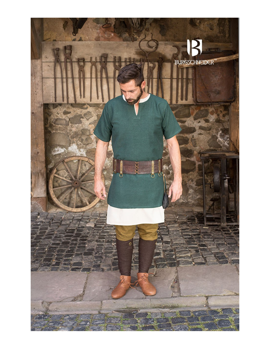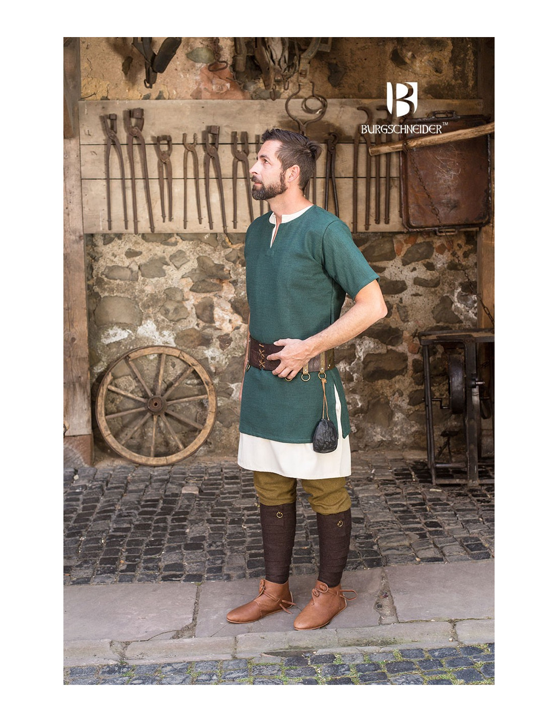 De groene middeleeuwse tuniek Aegir met korte mouwen van het gerenommeerde merk Burgschneider is het perfecte kledingstuk voor iedereen die zich wil onderdompelen in de middeleeuwse wereld. Deze tuniek is gemaakt van 100% katoen en biedt comfort en stijl in elk detail.