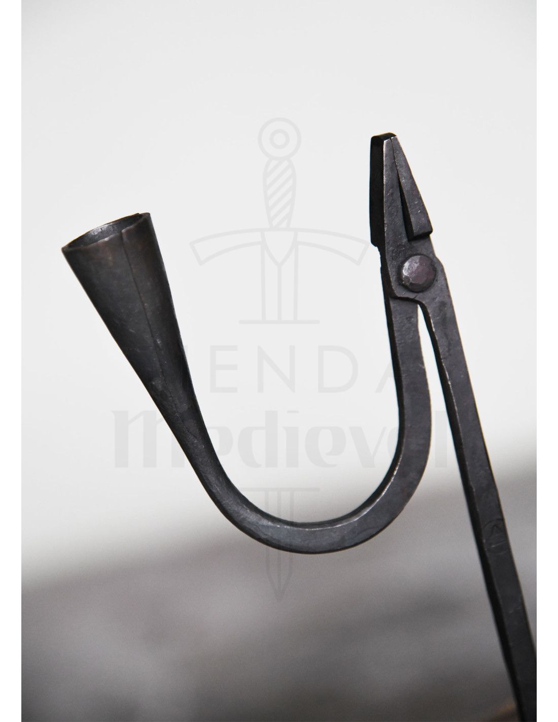 De donkere metalen afwerking en de gebogen vorm herinneren aan een stevige haak, wat niet alleen schoonheid toevoegt, maar ook een robuuste structuur die stabiliteit en duurzaamheid garandeert. Elk detail is ontworpen zodat je niet alleen verlicht, maar ook een ambachtelijk stuk hebt dat je omgeving verrijkt met een authentieke en ambachtelijke sfeer.
