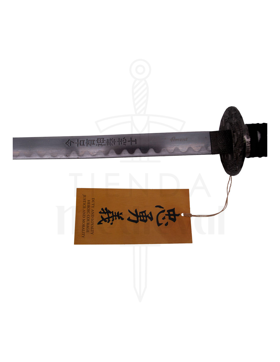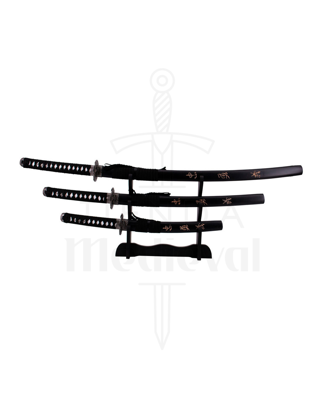 Het nauwgezette ontwerp van elke katana komt tot uiting in elk detail, van de zwarte schede met ingewikkelde letterdetails tot de hoogwaardige stalen messen. De Katana, met een indrukwekkende lengte van 100 cm, valt op als het middelpunt van deze collectie, gevolgd door de Wakisashi van 77 cm en de Tanto van 52 cm.