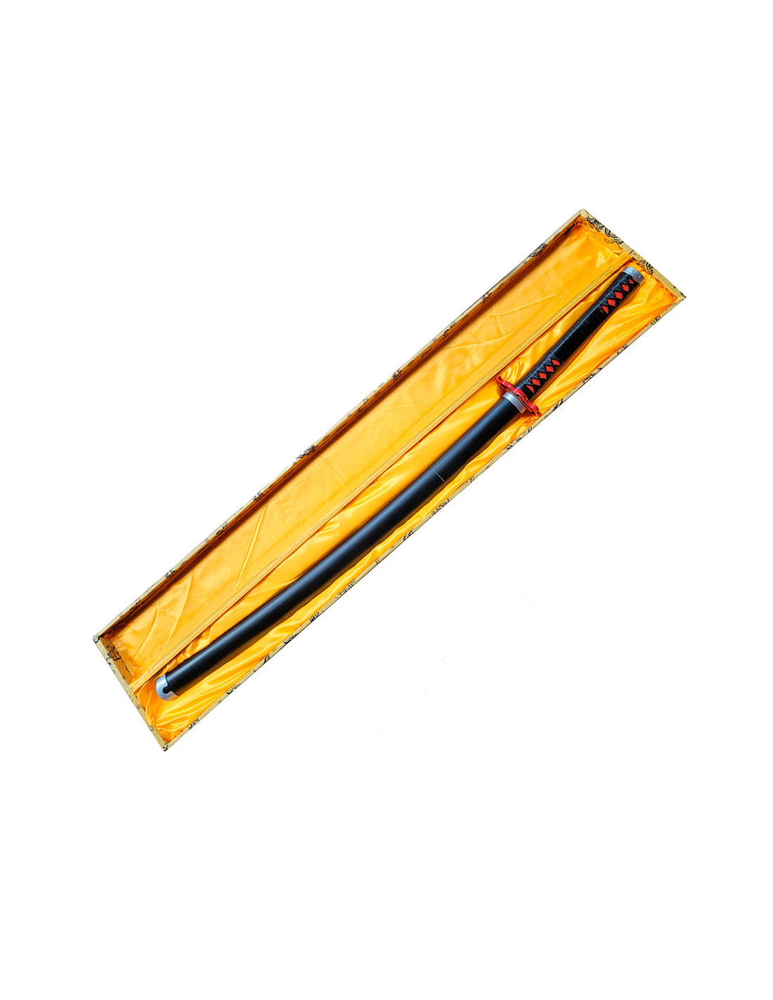 De Kamado Tanjirou beschikt over een rode tsuba die een opvallend visueel accent en bescherming voor de hand biedt. Het handvat, omwikkeld met zwart touw, garandeert een comfortabele en stevige grip, aangevuld met een imitatie van rood gestreept leer die elegantie en uniekheid aan het ontwerp toevoegt.