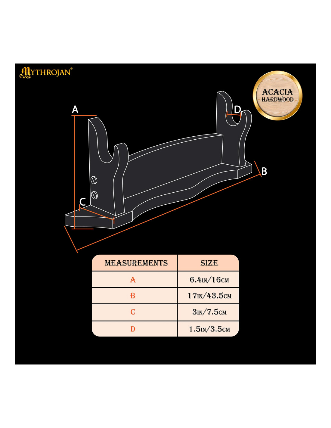 Het materiaal van deze standaard is massief hout, wat hem een stijlvolle en natuurlijke uitstraling geeft. De lengte van 44 cm biedt een resistente en stabiele ondersteuning voor uw zwaard, waardoor vallen of schade wordt voorkomen.