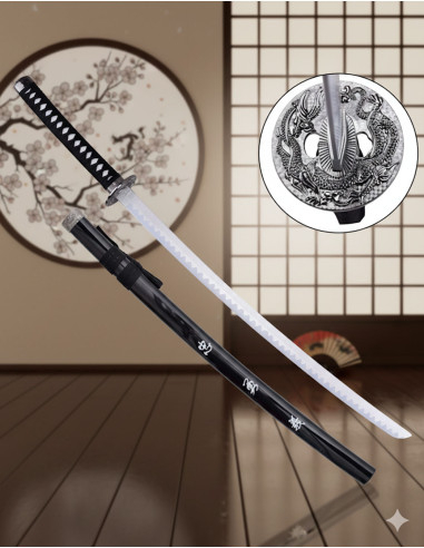 De zwarte gevlochten handgreep zorgt voor een stevige en comfortabele grip, ideaal voor tentoonstellingen of als verzamelobject. De plastic guard, versierd met een imposante draak, benadrukt de fantasie en het dramatische karakter van dit ontwerp en roept oosterse legendes en mythes op. De eenvoudige en stevige schede, met een zwarte afwerking en karakters op het oppervlak, complimenteert de esthetiek perfect en creëert een harmonieuze en betoverende set.