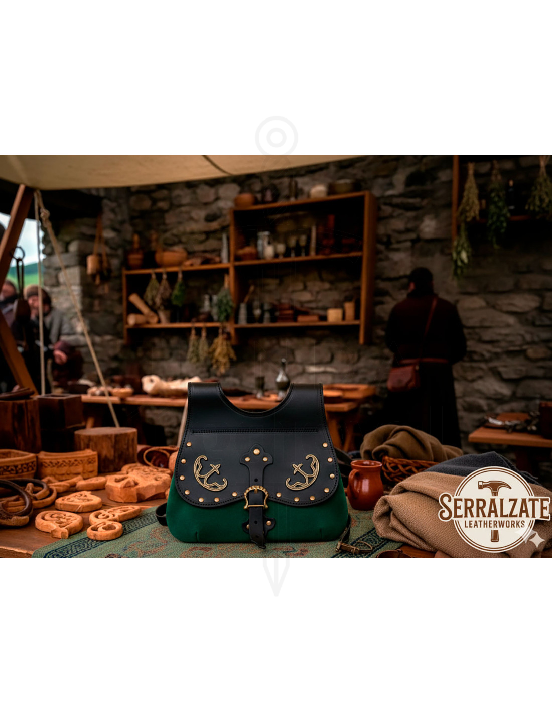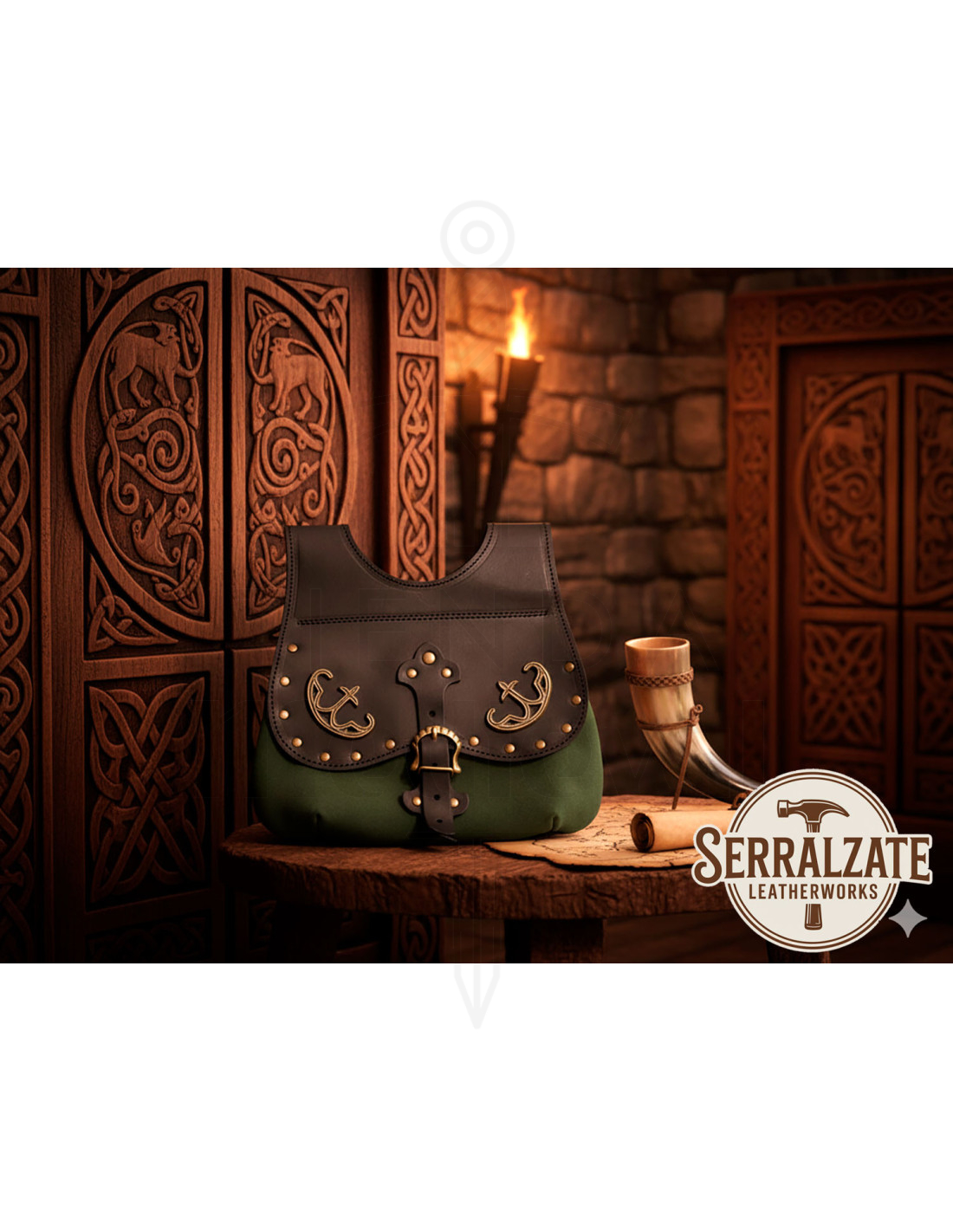 Wil je een handgemaakte tas kopen die stevig is en een middeleeuws-Keltisch charme uitstraalt? Deze Gareth tas in zwart-flesgroen is jouw perfecte keuze om op te vallen met authenticiteit en onderscheid.