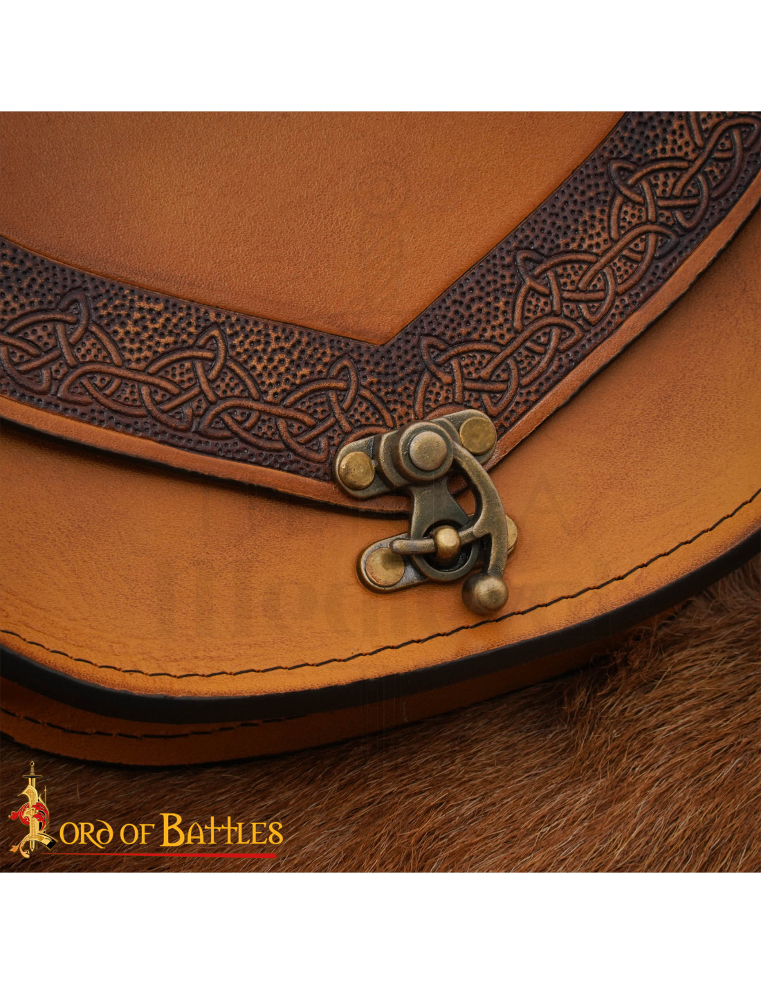 Deze tas combineert de warmte van echt leer met een opvallend Keltisch reliëf en biedt een praktisch stuk dat elke outfit aanvult, van je historische outfit tot je stedelijke look. De metalen sluiting in messingkleur houdt je spullen veilig, terwijl de halve cirkelvorm en ambachtelijke afwerking snelle toegang tot munten, sleutels, kaarten of kleine gereedschappen mogelijk maken, zonder elegantie te verliezen.