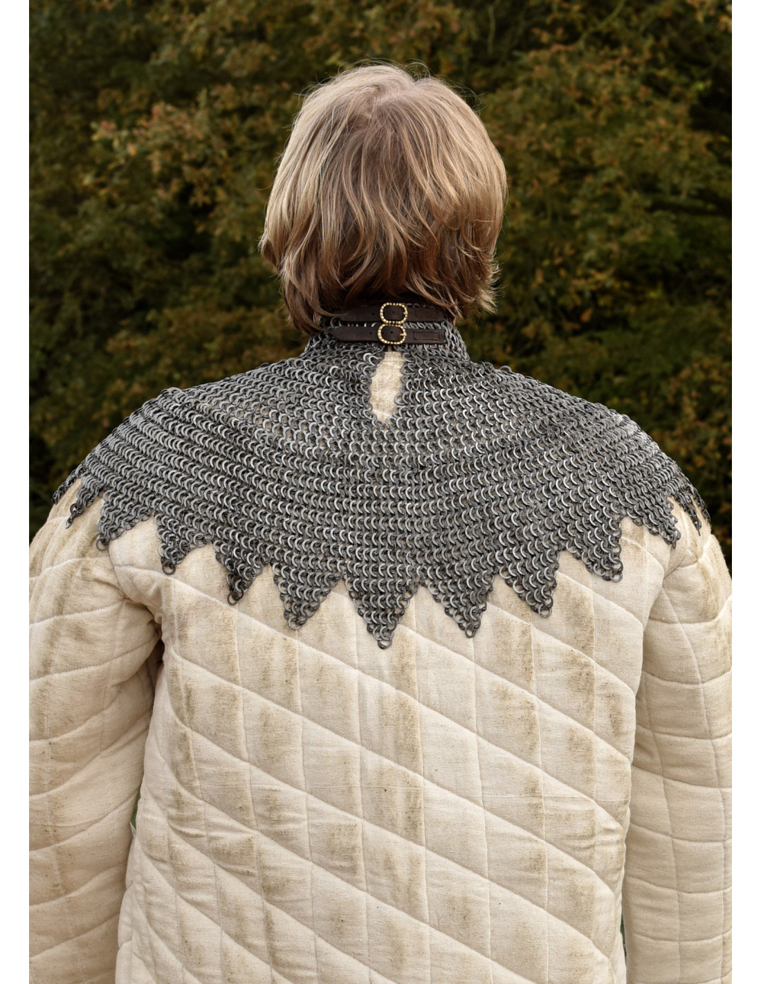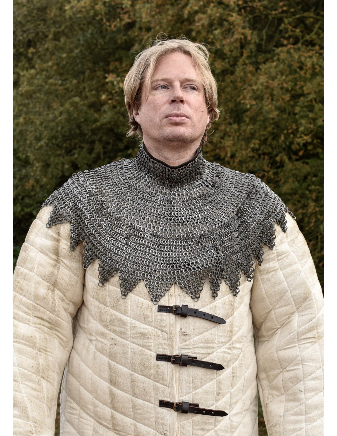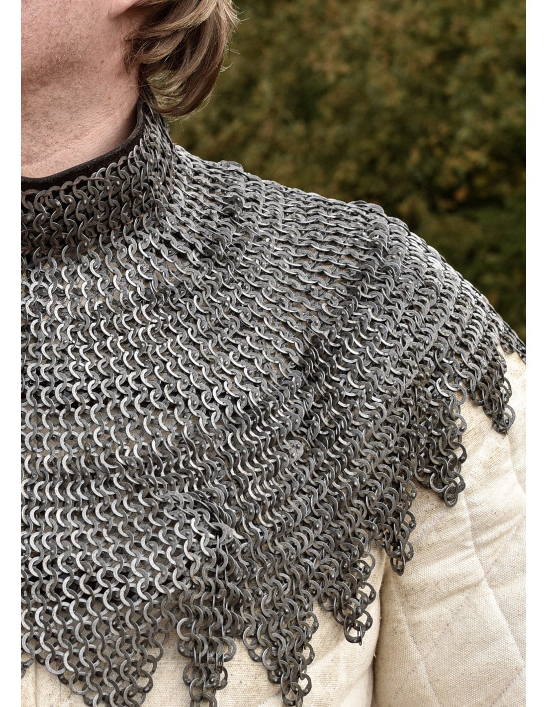 Het vlakke ringweefsel met ronde gesmede koppen garandeert uitzonderlijke sterkte, terwijl de getande rand een onderscheidend detail toevoegt dat trouw de brede snit van een bisschopsmantel nabootst. Het comfort wordt niet vergeten dankzij de binnenvoering van gesmeed leer, dat je huid verzorgt en een persoonlijke pasvorm garandeert via banden en gespen van echt messing die doen denken aan de middeleeuwen.