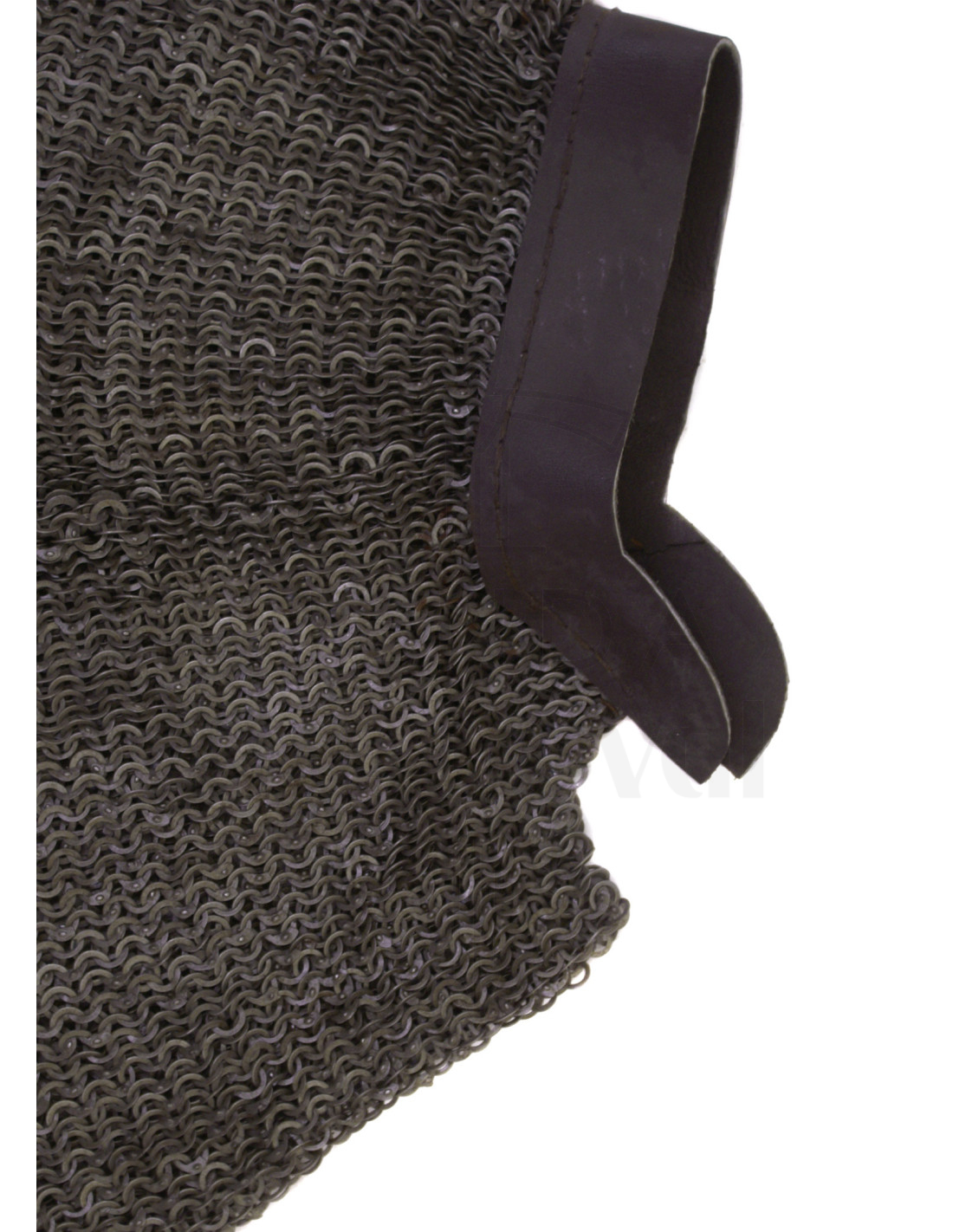 Dankzij de structuur met platte metalen ringen, elk perfect gerivet voor duurzaamheid, biedt het een stevige verdediging tegen slijtage en impacten, ideaal voor middeleeuwse recreaties of gesimuleerde gevechtsevenementen waar functionaliteit essentieel is. Het ontwerp bevat een onregelmatige rand die niet alleen een visueel onderscheidend accent geeft, maar ook een betere pasvorm en meer bewegingsvrijheid mogelijk maakt, zodat het pantser niet stijf of ongemakkelijk aanvoelt.
