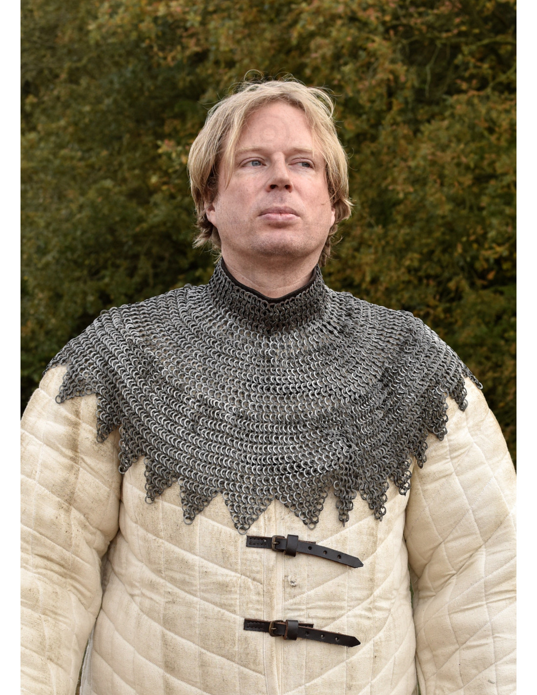 Het unieke geweven materiaal van platte ringen, gecombineerd met wigvormige spijkers, biedt uitzonderlijke weerstand en duurzaamheid, maar ook een lichtheid die bewegingsvrijheid en comfort tijdens langdurig gebruik mogelijk maakt. Bovendien accentueert de getande rand een authentieke stijl en vangt de essentie van de harnassen uit de 15e en 16e eeuw.