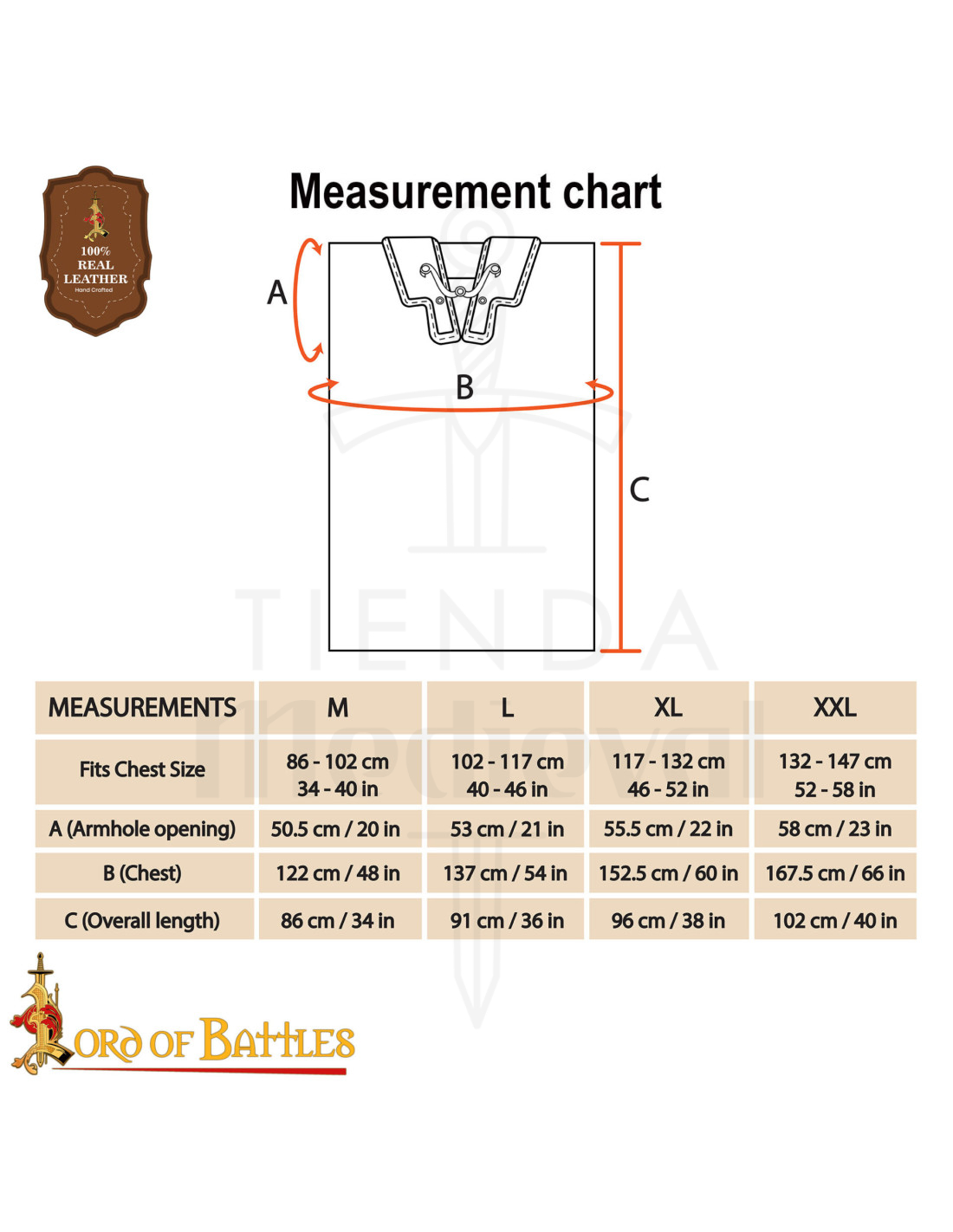Met een mouwloos ontwerp tot boven de dij, combineert dit stuk bescherming en lichtheid, perfect voor degenen die een authentieke Romeinse uitrusting samenstellen, deelnemen aan historische recreaties, stevige kostuums nodig hebben voor theater, of op zoek zijn naar een verzamelstuk met scenische aanwezigheid.