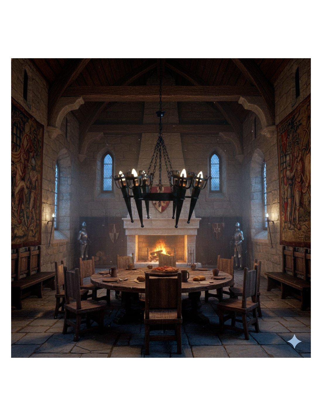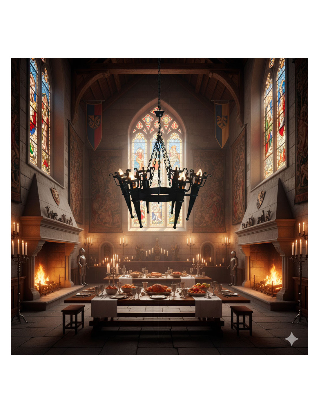 - Boeiend middeleeuws ontwerp: Met zijn in brand gestoken armen die beelden uit vervlogen tijden oproepen, is deze smeedijzeren lamp een kunstwerk dat de essentie van de middeleeuwen vastlegt. Elk detail, van de hangende kettingen tot het zorgvuldige vakmanschap, voegt een vleugje magie en mysterie toe aan elke omgeving.