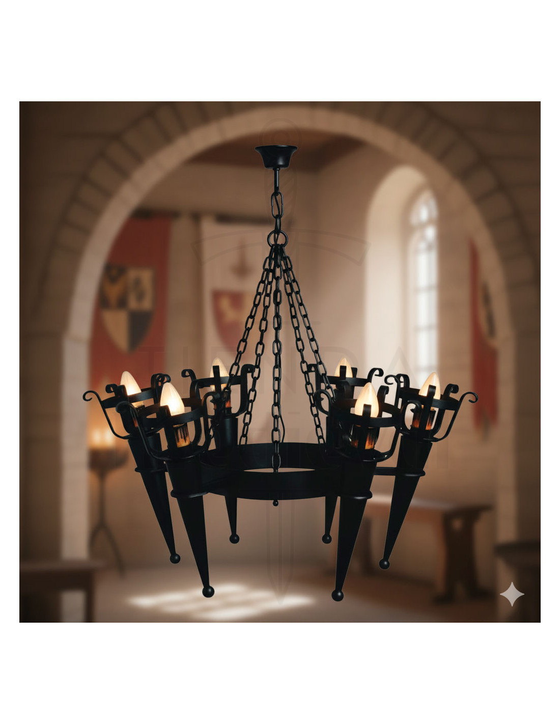 Verlicht uw omgeving met een vleugje middeleeuwse charme dankzij de smeedijzeren lamp met middeleeuwse fakkelarmen. Deze lamp, handgemaakt van smeedijzer met hangende kettingen, is de perfecte aanvulling op middeleeuwse en historische decoraties en voegt een vleugje authenticiteit en mysterie toe aan elke ruimte.
