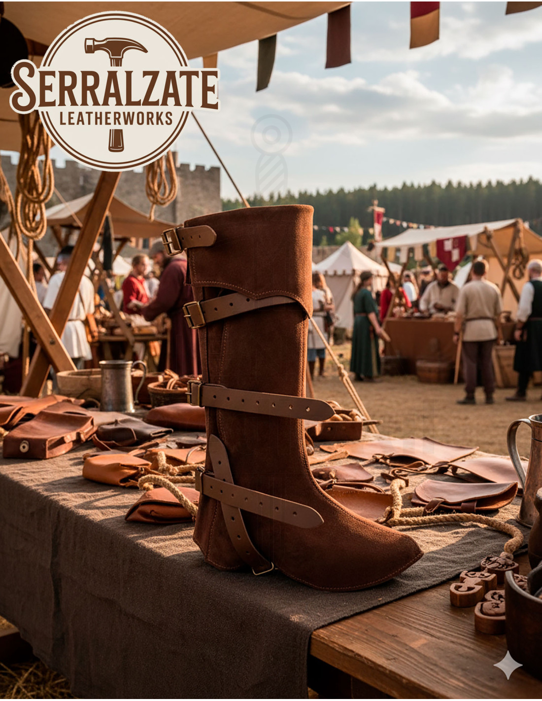 De middeleeuwse leren beenkappen model Esteban, in de kleur bruin, zijn de perfecte aanvulling voor wie authenticiteit en functionaliteit in zijn outfits zoekt. Gemaakt van zacht suede, passen ze comfortabel om het been en bieden ze een gevoel van comfort tijdens lange dagen. De riem onder de schoen zorgt ervoor dat de hoezen op hun plaats blijven, wat stabiliteit biedt, zelfs op oneffen terrein.