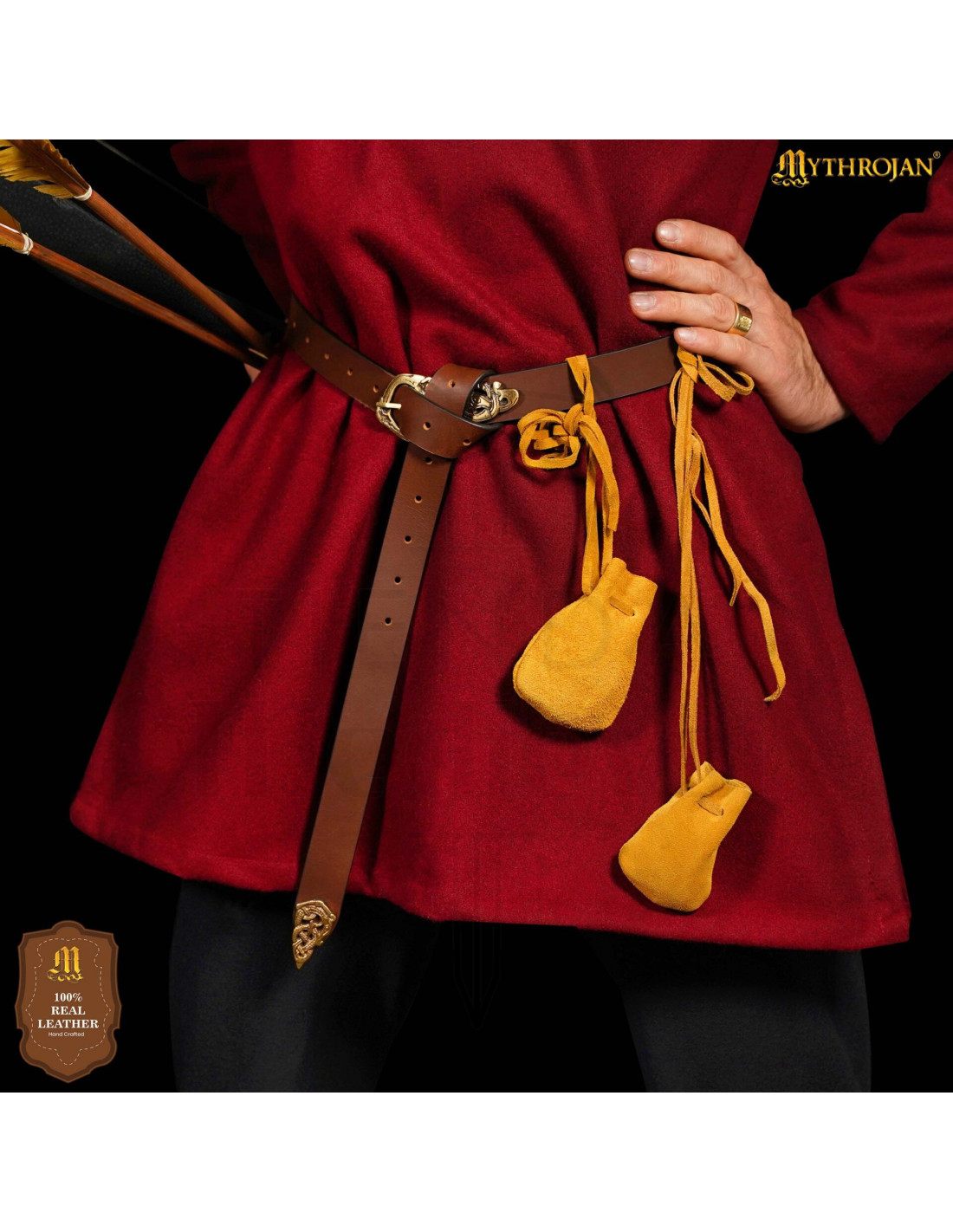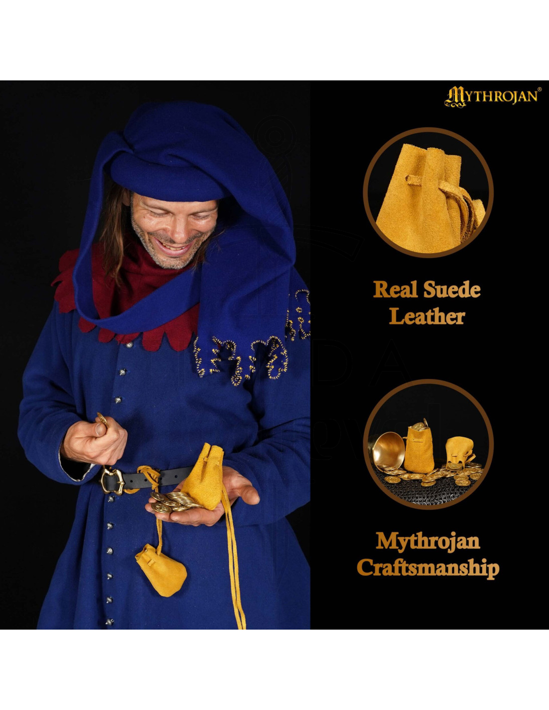 Ben je op zoek om je middeleeuwse of fantasieoutfit aan te vullen met een authentiek en praktisch accent? Deze set van 2 suède leren buideltasjes in levendige gele kleur is precies wat je nodig hebt om op te vallen tijdens je thematische evenementen. Met de hand vervaardigd uit hoogwaardig suède leer, bieden ze een rustieke en duurzame uitstraling, perfect voor LARP, renaissancemarkten, Vikingbijeenkomsten of SCA-evenementen.