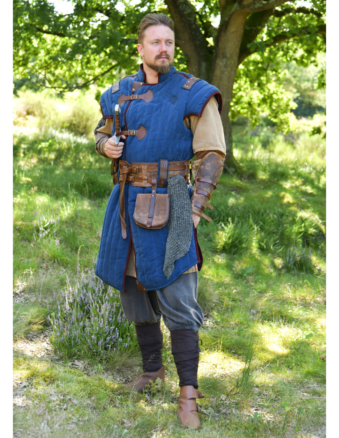 Met een uitstraling die de sporen van talloze veldslagen toont, brengt deze blauw-bruin versleten afgewerkte gambeson je direct terug naar de tijd van ridders en krijgers. Geïnspireerd door de beschermende kleding uit het einde van de Middeleeuwen, is hij ontworpen voor maximaal comfort en een weerstand die verhalen vertelt in elke naad. Zijn verweerde look, met gerepareerde gebieden en zichtbare klinknagels, zorgt niet alleen voor authenticiteit, maar weerspiegelt ook de ervaring van degene die hem draagt.
