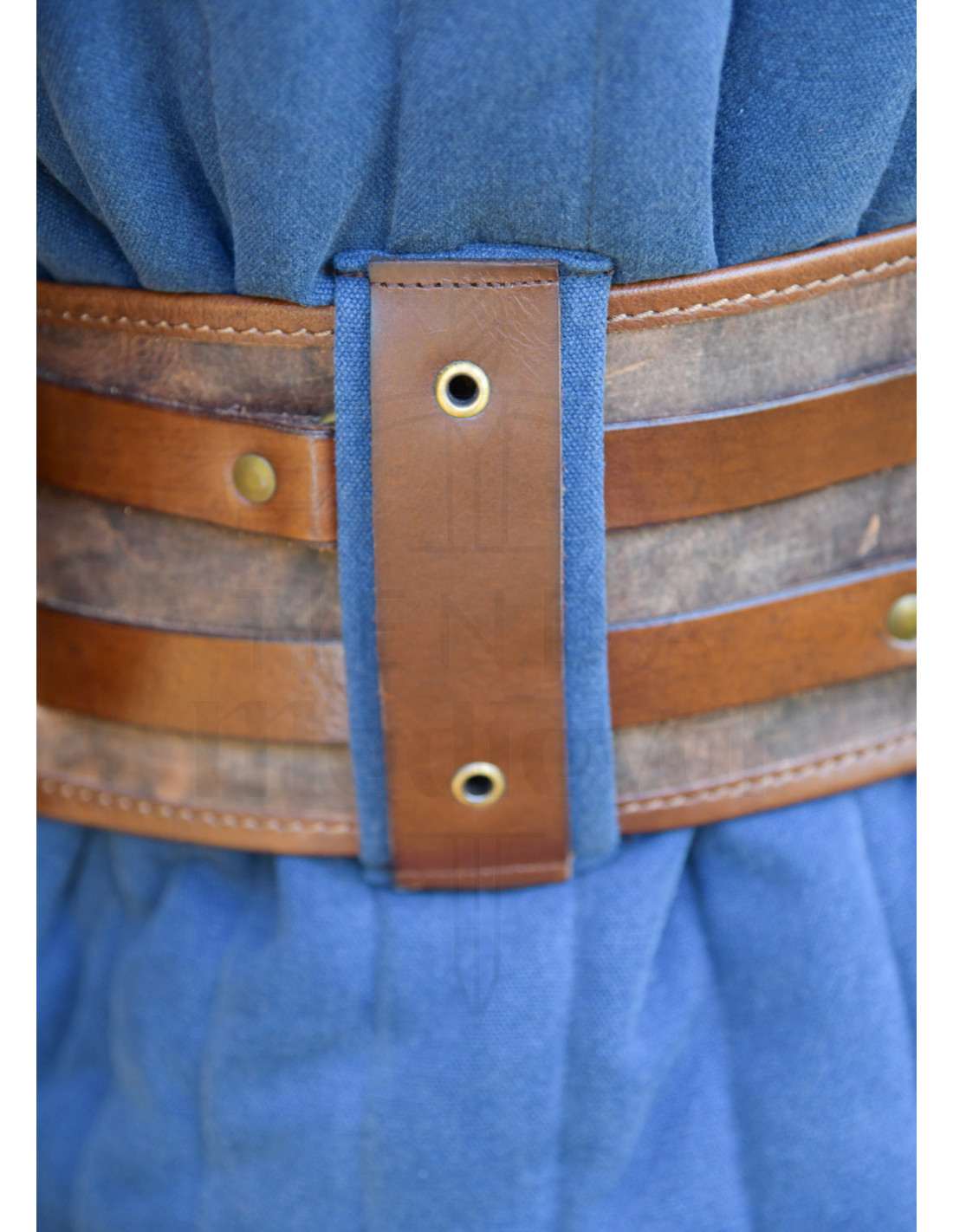 De hoge kraag en het sluitingssysteem aan de voorkant, met leren gespen, zorgen voor een veilige en comfortabele pasvorm, ideaal om te combineren met riemen en pantseronderdelen. De zij-openingen maken beweging vrij, waardoor bijna volledige vrijheid ontstaat tijdens gevechten of dynamische activiteiten. Bovendien zijn de schouderbanden perfect om extra beschermingsstukken vast te maken, wat de functionaliteit benadrukt.