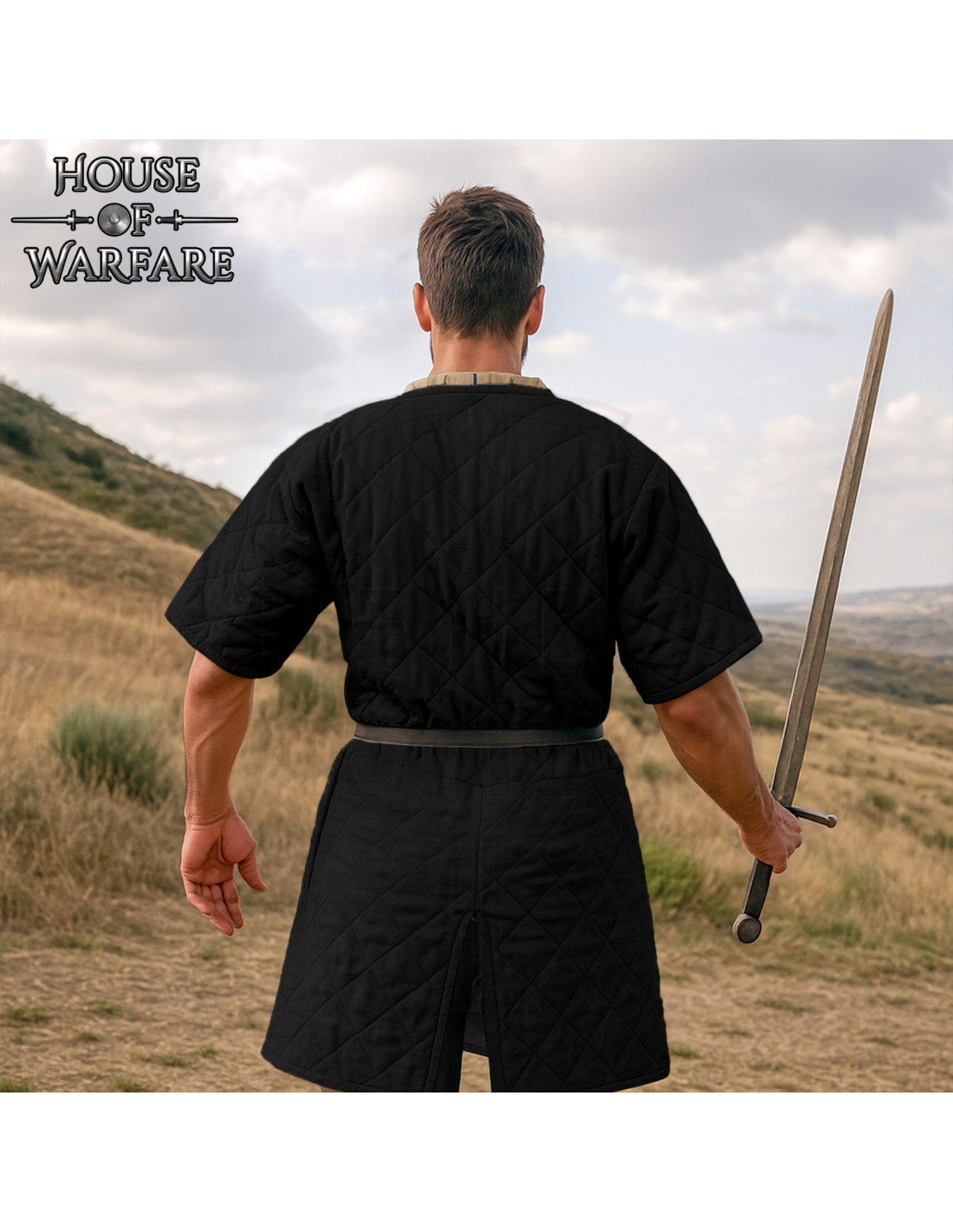De snit met halve mouwen maximaliseert de mobiliteit en ventilatie, ideaal voor rollen die snelle bewegingen vereisen, boogschieten of intense gevechten, en vergemakkelijkt het gebruik met handschoenen of onder metalen bescherming zonder de reikwijdte van je armen te beperken. De constructie met versterkte naden zorgt ervoor dat het kledingstuk intensief gebruik en echte eisen in HEMA-, SCA- en LARP-praktijken aankan.