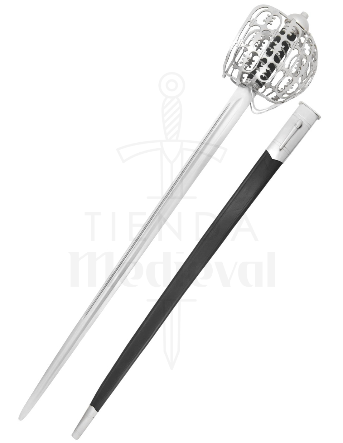 De handgreep met houten kern, bekleed met zwart leer en afgewerkt met een draadwikkeling, zorgt voor een stevige grip en visueel trouw aan het origineel, wat warmte aan de aanraking en een historische afwerking biedt. De open geweer van staal, fijn uitgesneden en geperforeerd, omarmt de hand met een ornamentaal karakter dat ook stevigheid en visuele bescherming uitstraalt.