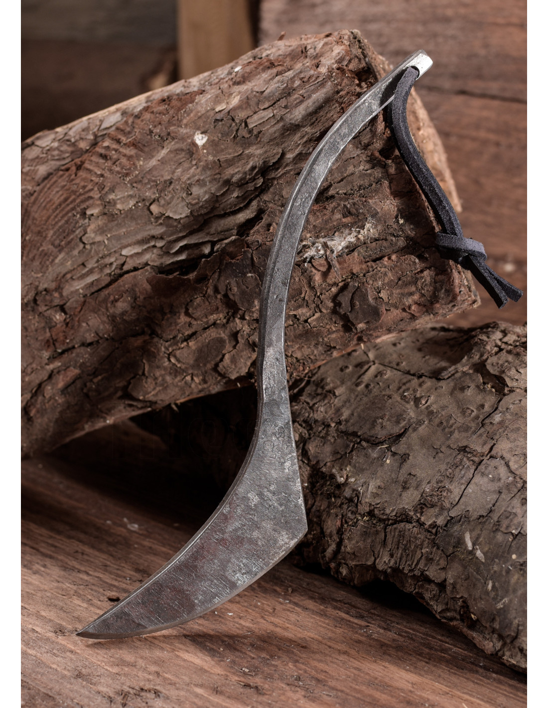 Dit mes is niet alleen een functioneel stuk, maar ook een perfect ornament voor historische recreaties, tentoonstellingen of verzamelingen van oude artefacten. De matte afwerking en de klassieke vorm roepen de essentie op van een tijdperk waarin ambacht en nut hand in hand gingen, waardoor je je elke keer dat je het gebruikt of tentoonstelt deel voelt van die geschiedenis.