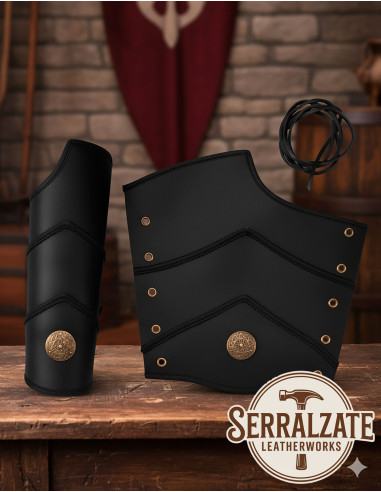 De middeleeuwse leren armbanden Guillermo in zwart zijn een uitzonderlijk accessoire dat robuustheid en flexibiliteit combineert, waardoor ze de ideale keuze zijn voor elke liefhebber van historische recreatie of middeleeuwse stijl. Gemaakt van zacht leer, hebben deze armbanden een ontwerp met drie nauwkeurig genaaide segmenten, wat uitstekende bewegingsvrijheid mogelijk maakt en ze perfect maakt voor zowel gevechtsactiviteiten als dagelijks gebruik.