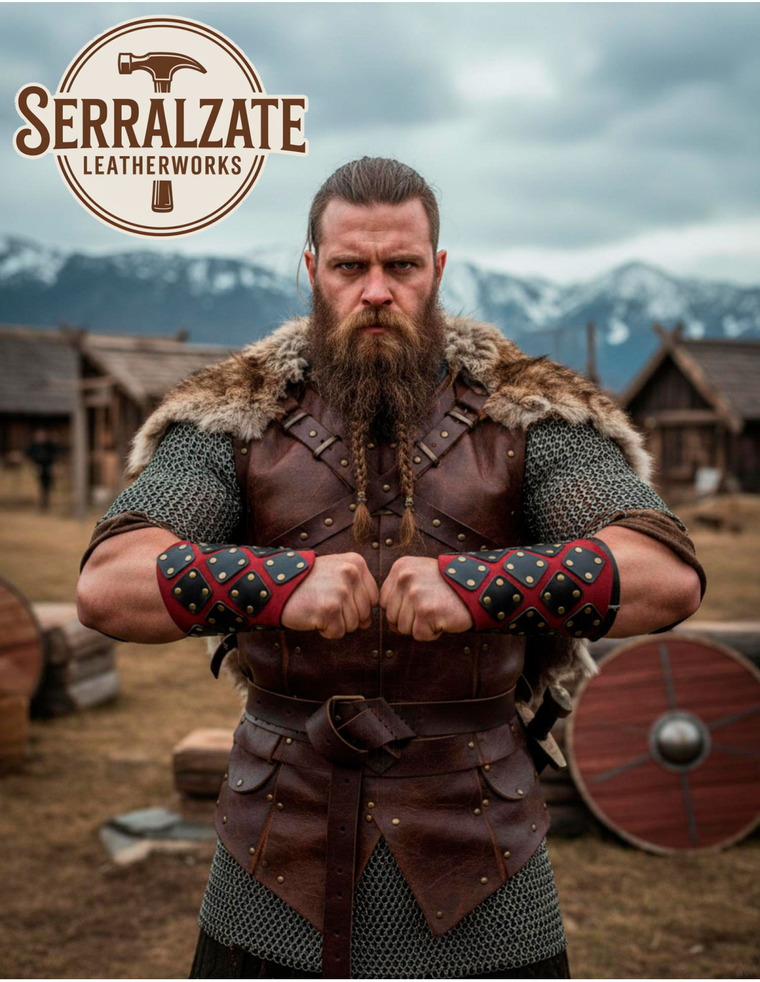 De Rode leren brigandine armbanden voor avonturiers combineren esthetiek en functionaliteit in een stuk dat gemaakt is om op te vallen, met een diep scharlakenrood dat contrasteert met zwarte platen in een geometrisch patroon, wat zorgt voor een zowel felle als verfijnde uitstraling.