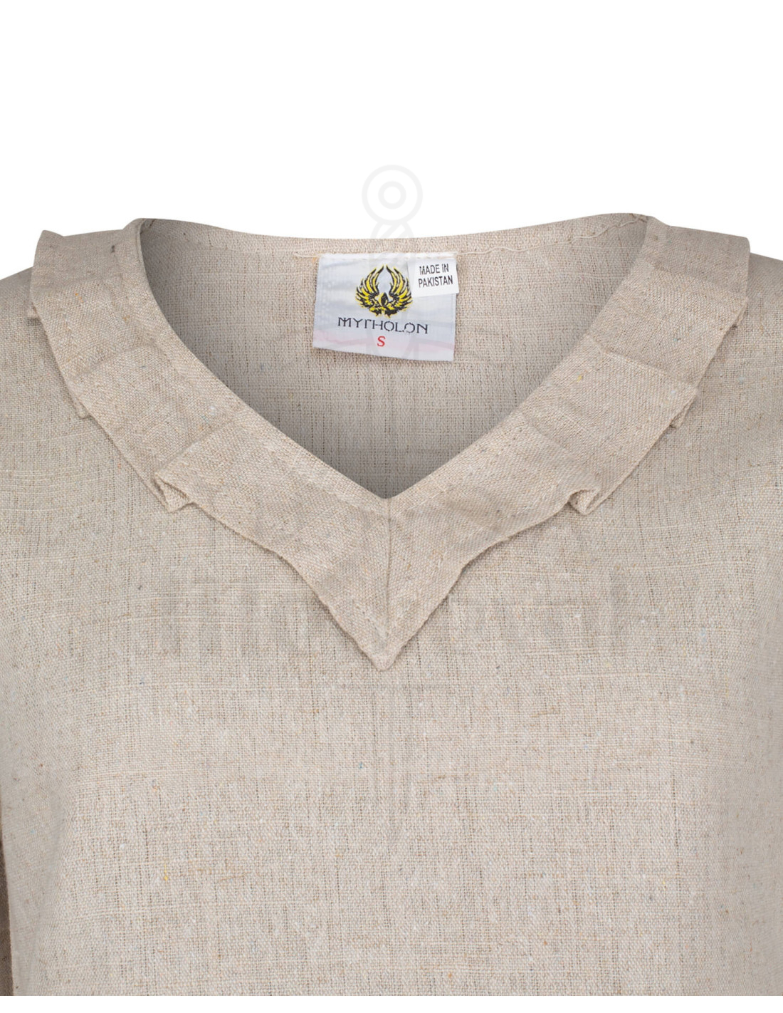 Ben je op zoek naar een vleugje elegantie in je middeleeuwse kledingstijl of wil je gewoon een frisse en verfijnde uitstraling tijdens je rustigere dagen? De Josefina blouse van natuurlijke linnen is de perfecte keuze voor jou. Licht, ademend en vol karakter, het ontwerp met V-hals en gekrulde afwerking accentueert je nek op een delicate en romantische manier. De driekwart mouwen bieden comfort en veelzijdigheid, ideaal voor warme klimaten of te combineren met verschillende stijlen.