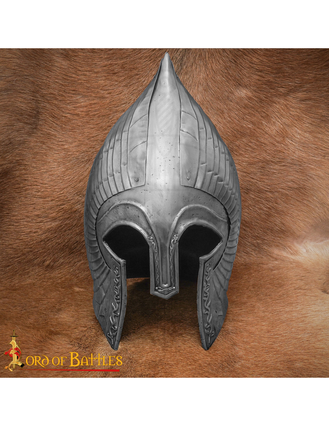 Met de hand vervaardigd uit 18 gauge staal combineert deze helm duurzaamheid met een oude stijl, afgewerkt met een patina die de tand des tijds en veldslagen nabootst. De spitsvorm en reliëfdetails aan de zijkanten roepen de uitstraling op van middeleeuwse helmen, aangevuld met een 'T'-vormig ontwerp aan de voorkant, geïnspireerd door de bewakers van de verdediging van Minas Tirith.