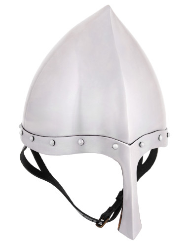De functionele Italiaanse Battle Nose-helm uit de 12e eeuw is een echte historische schat die je meeneemt naar een tijd van ridders en dappere krijgers. Geïntroduceerd door de Noormannen die Sicilië veroverden en op weg waren naar Zuid-Italië, deze helm is gemaakt van 2 mm dik staal en zorgt voor optimale bescherming tijdens je gevechten.