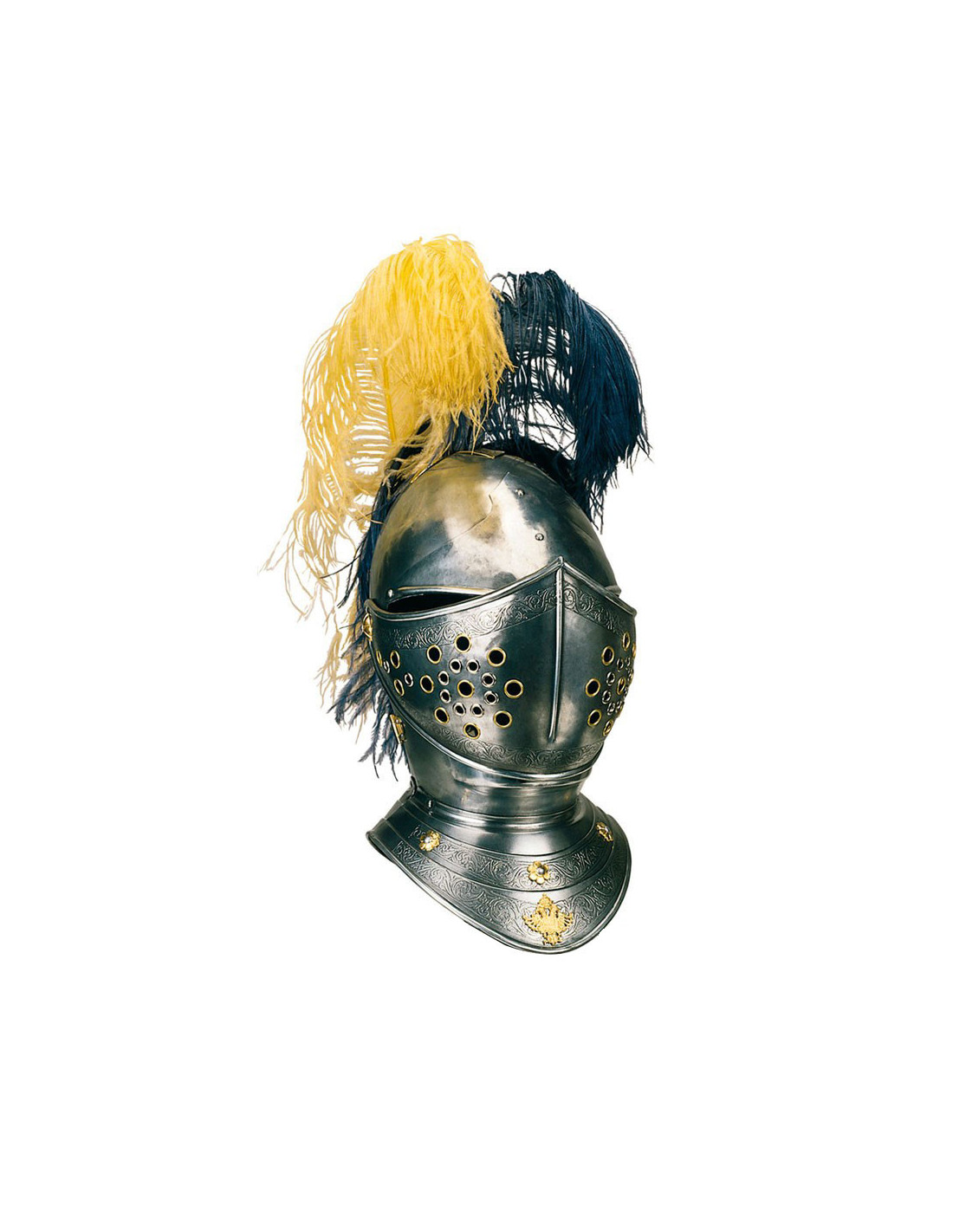 De Helm is het 'pantser dat het hoofd bedekt en verdedigt'. In de eerste middeleeuwen werd een eenvoudige metalen helm gebruikt om het hoofd te beschermen, conisch van vorm, zonder vizier of halsslagader, waaraan in de 10e eeuw het rechte neusaanhangsel werd toegevoegd. Later werd het vizier toegevoegd, het mobiele deel en het belangrijkste deel van de helm of helm, bedoeld om het gezicht van de krijger te bedekken tijdens het gevecht, dat omhoog ging als er behoefte was om adem te halen en de objecten beter te onderzoeken . In de Middeleeuwen bestond het uit drie delen: