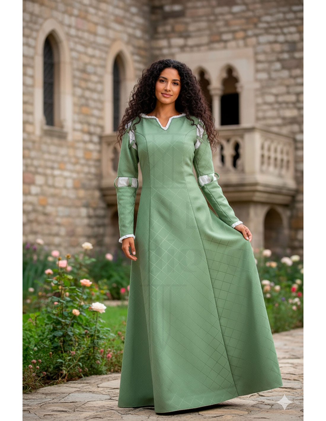 De middeleeuwse jurk Mérida in groene kleur is een echt juweel voor vrouwen die zich willen voelen als courtisane uit die tijd. Dit verfijnde kostuum, gemaakt van licht gekleurd katoen met een patroon, brengt je direct naar de boeiende wereld van de Italiaanse mode uit de 16e eeuw.