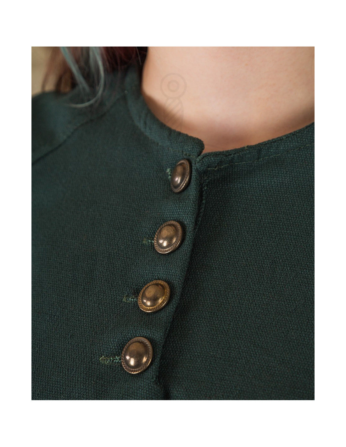 Ontdek de charmante middeleeuwse jurk Jovina in groen en vervoer je stijl naar de middeleeuwen. Deze eenvoudig gesneden jurk is voorzien van knopen aan de hals en mouwen. Het is gemaakt van duurzaam katoencanvas, houdt je warm op koelere dagen en kan ook als eenvoudige buitenlaag worden gedragen.