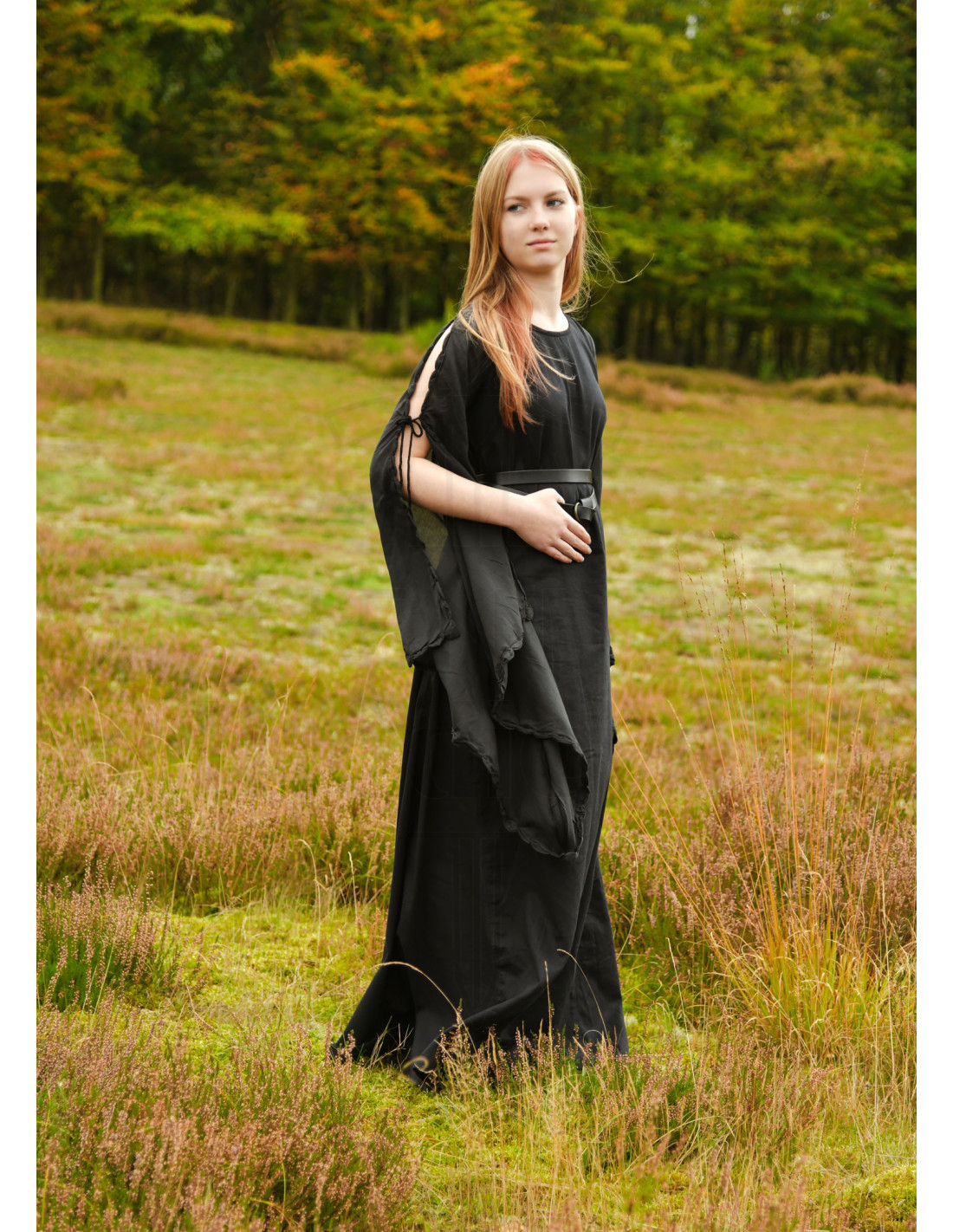 De Middeleeuwse Ingrid jurk met kordels op de rug, kleur zwart, valt op door de verstelbare ruglijn met een elegante cordon, waarmee je de silhouet naar wens kunt vormen, en een gedefinieerde taille kunt creëren zonder in te boeten op bewegingsvrijheid. De borstpleats zorgen voor een flatterende pasvorm, terwijl de katoenstof een lichte en ademende sensatie biedt voor een hele dag draagcomfort.