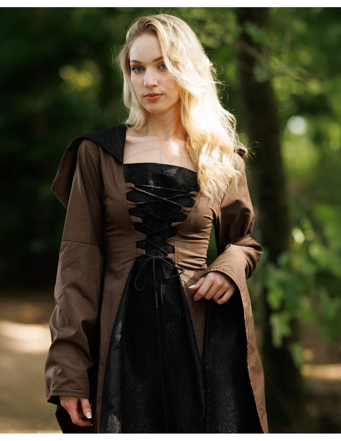 Perfect voor historische evenementen, markten en momenten dat je elegant wilt opvallen, is Ophelia ook comfortabel voor lange wandelingen dankzij de snit die dicht bij de enkel valt, wat het lopen vergemakkelijkt zonder te hinderen. Als je op zoek bent naar een Middeleeuwse katoenen jurk model Ophelia, zwart-bruin, dan vind je een kledingstuk dat historische esthetiek en modern comfort verenigt.