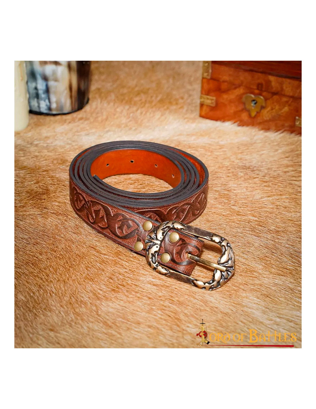 Introductie van de bruine leren renaissanceriem met reliëf, een stuk vakkundig vervaardigd door onze getalenteerde ambachtslieden en zorgvuldig afgewerkt met hoogwaardige details. Deze riem is een waar juweel dat niet alleen zijn praktische functie vervult, maar ook een vleugje authenticiteit en stijl toevoegt aan je renaissance-outfit.