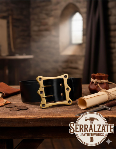 Ontdek de **Middeleeuwse brede riem Ivo - Zwart** van Serralzate LeatherWorks, de perfecte keuze voor wie op zoek is naar een accessoire dat authentiek ontwerp combineert met uitzonderlijke functionaliteit. Met de hand vervaardigd uit hoogwaardig leer, is deze riem niet alleen stevig en duurzaam, maar valt ook op door zijn verzorgde middeleeuwse esthetiek en veelzijdigheid. De klassieke zwarte kleur geeft een sobere en elegante uitstraling die zowel past bij historische kostuums als bij dagelijks gebruik met een onderscheidend accent.
