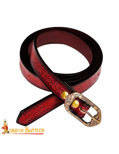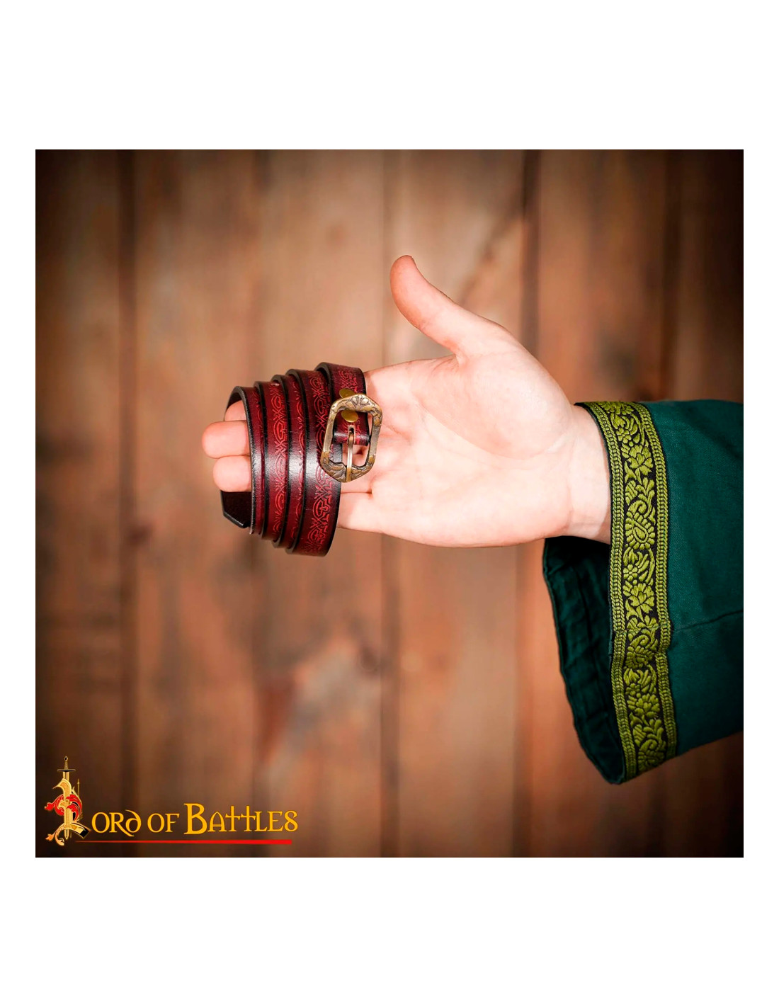 Gemaakt van echt buffelleer, valt deze riem niet alleen op door zijn schoonheid, maar ook door zijn duurzaamheid, en biedt hij een stuk dat je stijl begeleidt zonder in te boeten aan comfort of stevigheid. Het delicate reliëf in bordeauxkleuren geeft een verfijnde en middeleeuwse uitstraling die alle blikken zal trekken, waardoor een eenvoudig accessoire het middelpunt van je ensemble wordt.