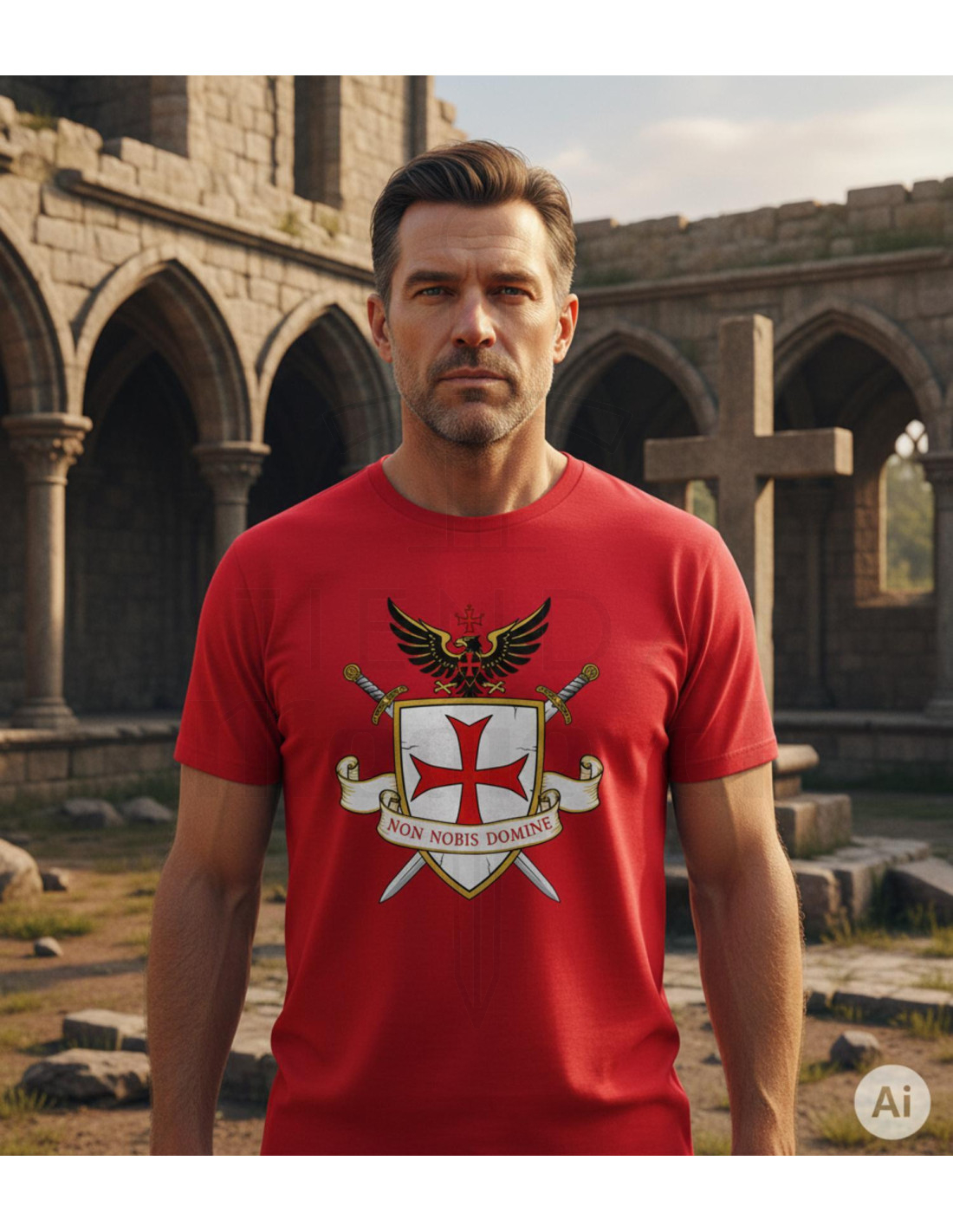 De rode Templaria T-shirt voor heren, Non Nobis Domine, is ontworpen voor wie een look met persoonlijkheid wil en tegelijkertijd een zachte, ademende en comfortabele kledingstuk zoekt dat de hele dag door gedragen kan worden. Het ontwerp wordt geïntegreerd in de stof via directe digitale print, wat zorgt voor een strakke afwerking zonder zichtbare vlekken en duurzaamheid na herhaald wassen.