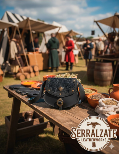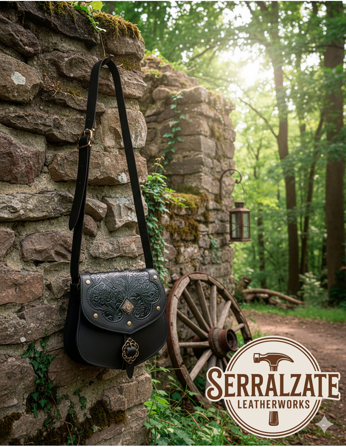 De middeleeuwse leren tas model Escudero, in zwarte kleur, combineert stijl en functionaliteit perfect en biedt een onderscheidende touch voor elke gelegenheid. De gedetailleerde versieringen en uitgewerkte gespen geven het een speciaal karakter, terwijl de florale gravure op de flap een artistieke uitstraling met historische herinneringen toevoegt.