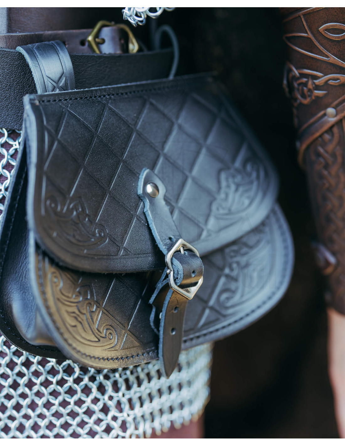 Volledig vervaardigd uit hoogwaardig leer, gemaakt in de werkplaats 'Fucina del Drago' met Italiaans runderleer uit Toscane, garandeert duurzaamheid en een authentiek tintje. De gladde en stevige afwerking, samen met reliëfmotieven en decoratieve details aan de randen, geven het een onderscheidende en verfijnde uitstraling. De metalen gesp en de verstelbare riem maken het gemakkelijk te dragen en zeer praktisch, ideaal voor liefhebbers van middeleeuwse stijlen, ridders of gewoon voor wie wil opvallen met een uniek accessoire.