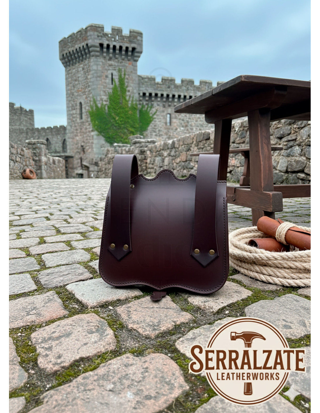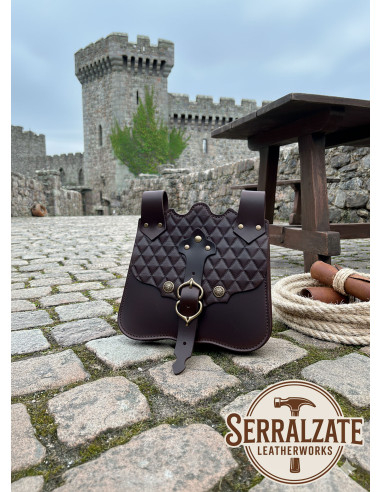 Met de hand vervaardigd in Spanje, valt deze zwarte leren zak op door zijn kwaliteit en perfecte afwerking. De details van middeleeuwse ruiten geven een authentiek en verfijnd accent, perfect voor wie zich wil onderdompelen in een historische sfeer of zijn outfit wil aanvullen met een karaktervol accessoire.