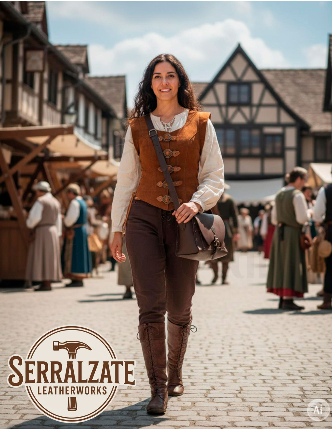 Het schouderontwerp zorgt voor comfortabel en praktisch dragen, met voldoende ruimte om je essentiële spullen op te bergen zonder stijl te verliezen. Dankzij de Zamak gesp blijft je bezitting altijd veilig, en voegt het een authentiek middeleeuws tintje toe. De keuze voor natuurlijk leer, dat eenvoudig te verzorgen is, zorgt ervoor dat je tas zijn karakter en weerstand behoudt tijdens al je avonturen.
