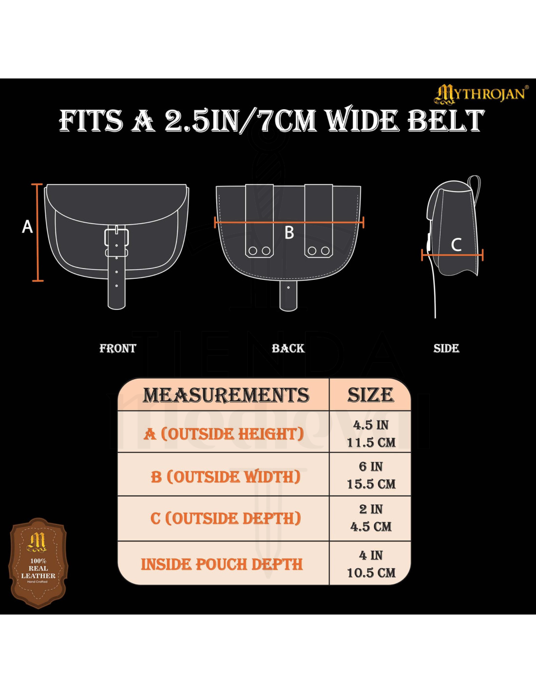 De sluiting combineert een centraal metalen gesp, zichtbaar en eenvoudig te gebruiken, met een voorband die wordt vastgezet met een verouderde gouden gesp, wat dubbele zekerheid en verstelbaarheid biedt zodat niets verschuift tijdens gebruik. De stevige banden maken een veilige bevestiging aan brede riemen mogelijk, passend bij Viking-, koopmans- of renaissancestijl kleding zonder stabiliteit te verliezen.