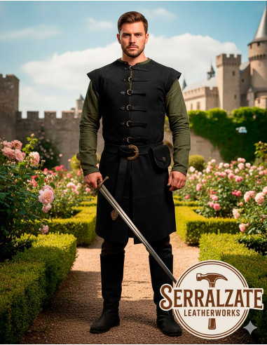 Ontdek de middeleeuwse tuniek Baldomero in het zwart, een uniek kledingstuk ontworpen door Serralzate LeatherWorks dat functionaliteit en klassieke stijl combineert met de hoogste ambachtelijke kwaliteit. Met zorg vervaardigd in Spanje, biedt dit stuk alles wat je nodig hebt om op te vallen tijdens live rollenspellen, middeleeuwse beurzen of elke activiteit geïnspireerd op die periode.